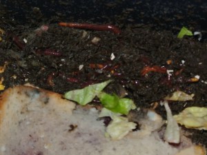 So Bishop tells us about the worm discovery…..OK I will. I was tidying up the kitchen today and discovered some old and wilted lettuce that was begging to be fed to the worms. Let me set the stage for the discovery. A week ago my son Joe brought home from school an uneaten PB&J sandwhich….peanut butter & jelly just in case PB&J is a foreign term. My wife suggested that I share it with the worms. I thought about it for a couple of days – really I forgot about the suggestion until reminded by my wife. I wasn’t sure if it was proper fare for the worms but decided to see what would happen. Before I left on my recent trip I noticed what seemed to be a cluster of worms congregating near the PB&J. When I looked today I noticed a similar cluster and what appears to be evidence of”worm bites” along the edge of the sandwich. (see photo above)