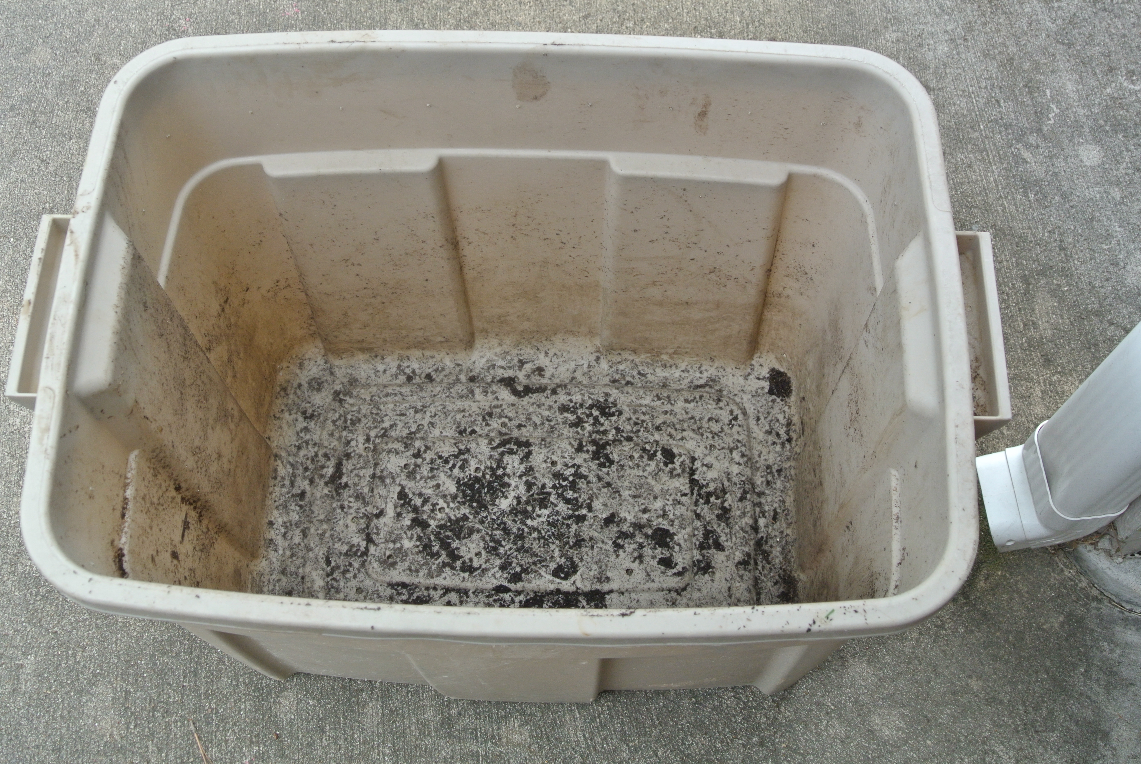 My 36 Quart Rubbermaid bin ready to be cleaned our for my worms. The holes drilled in the bottom to allow air in for the worms also work as drain holes for potato growing. Double use again.