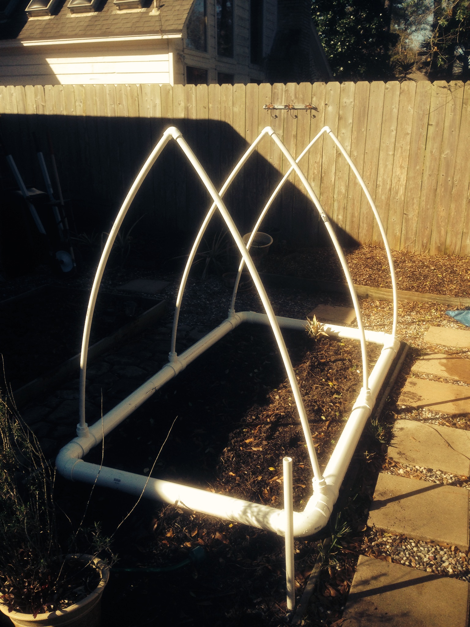My newest adventure with the leftover pvc from my youngest son’s Engineering project at Texas A&M University is shown below. I did have to buy a couple extra joints beyond the 12″ of 3″ pipe he needed but what the heck! I have started construction on a mini greenhouse with the hope of getting my tomatoes off to an early start! Is it possible for me to have ripe tomatoes before May 1st? That will be my challenge!