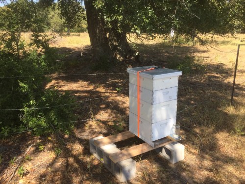 The hive seems to like it’s new home.  It is in a small fenced area to keep the cattle out and has enough sun under the big oak tree. There is a stock tank for water very close by. Looks like bee heaven.