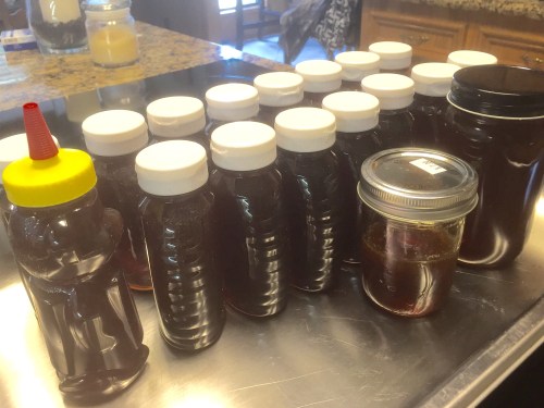 My haul from the northern hive was small but very tasty. Most of the honey was bottled in 3/4 pound plastic Queenline bottles. I made a little larger bottle as payment to the hive’s host.  About 13.5 pounds total for this trip. The hive is now in winter mode and the honey remaining is for the bees.
