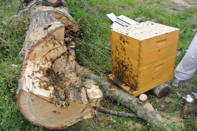 The hive box with 20 frames containing the comb rubber banded into the frames. added a super shortly after this.