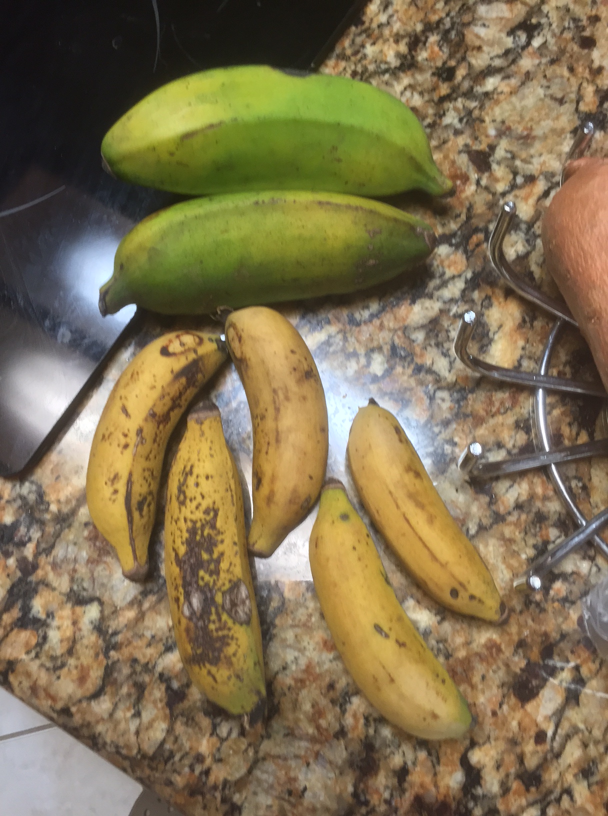 Two Burro bananas still ripening and 5 ripe Manazano bananas ready to eat.