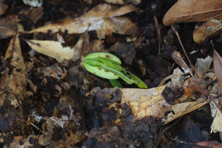 Wow, in just three days this bean is leaping up. Looking around the base of the tepee towers, I see several others peeking through the leaf and compost mulch.