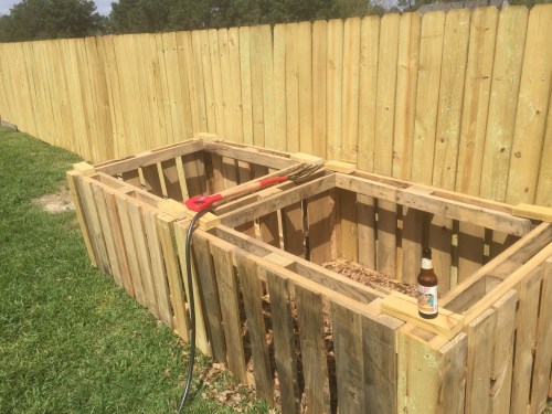 He brought some,very well made, pallets home from work and- lo and behold – ready to go compost bins! Hey Ben – I found a cold Sculpin IPA out there- thanks!