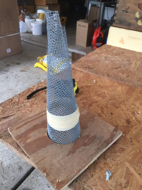 Start with 1/8 inch(#8 hardware cloth), create a cone with an exit hole a little larger than than a pencil thickness. I drilled a 2 5/8 inch hole in a thin piece of plywood, sized so 6 or 7 inches of the cone protruded through. Trimmed the fat end to create wings, covered the wings with duct tape and secured with staples.