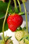 A ripe Pineberry. At this stage it is almost overripe. The best stage is just a blush of pink and the seeds are red. The flavor is similar to a pineapple with a hint of strawberry.