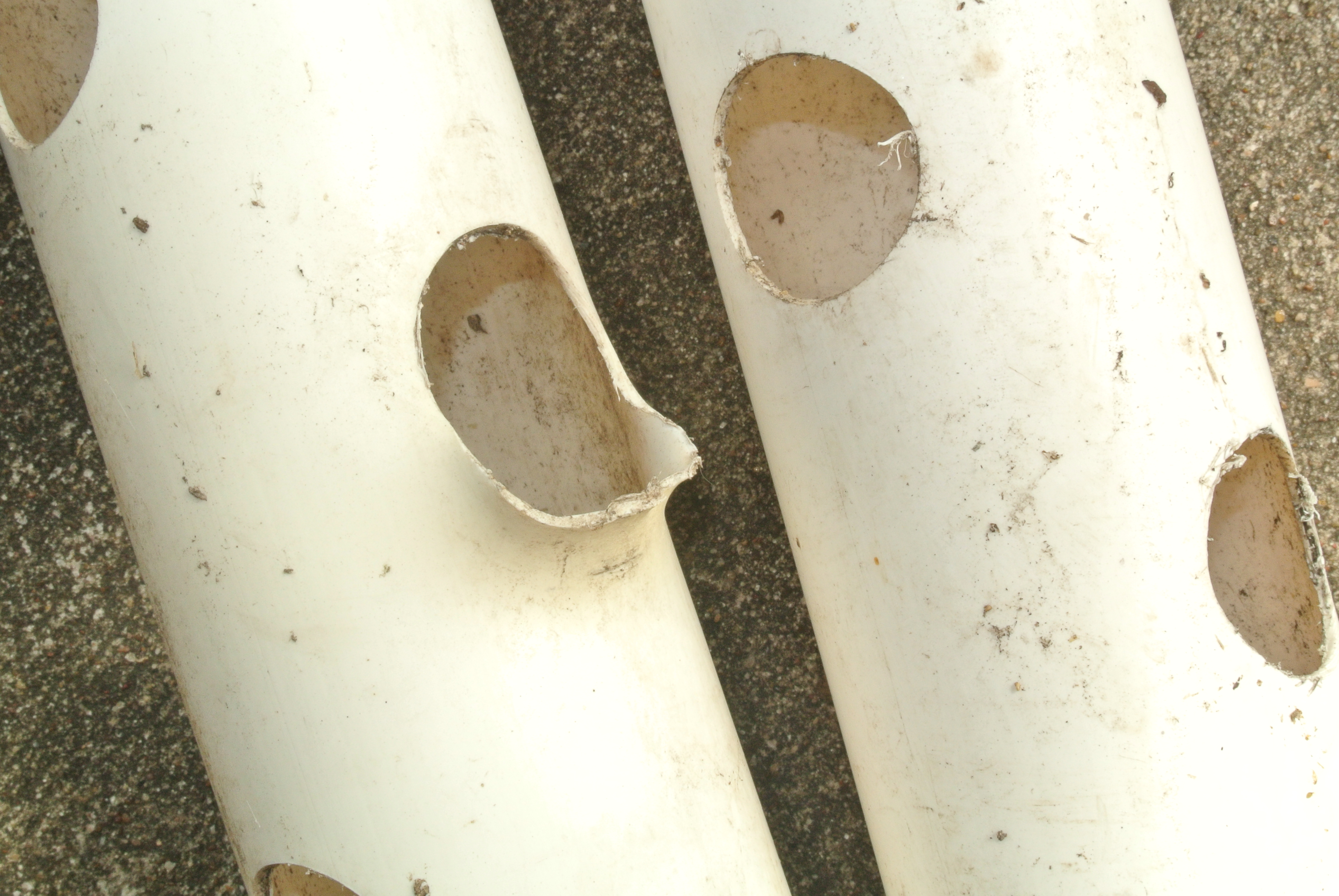With V 3.1 I started with 3″ PVC drain pipe and I chose the version that created pockets rather than drilled holes. I spaced them a little closer and arranged them in a logical and orderly fashion. I should be able to get 28 plants in a space that would have held 2-3 plants in a matted row system and much easier for an old guy to harvest without bending over.