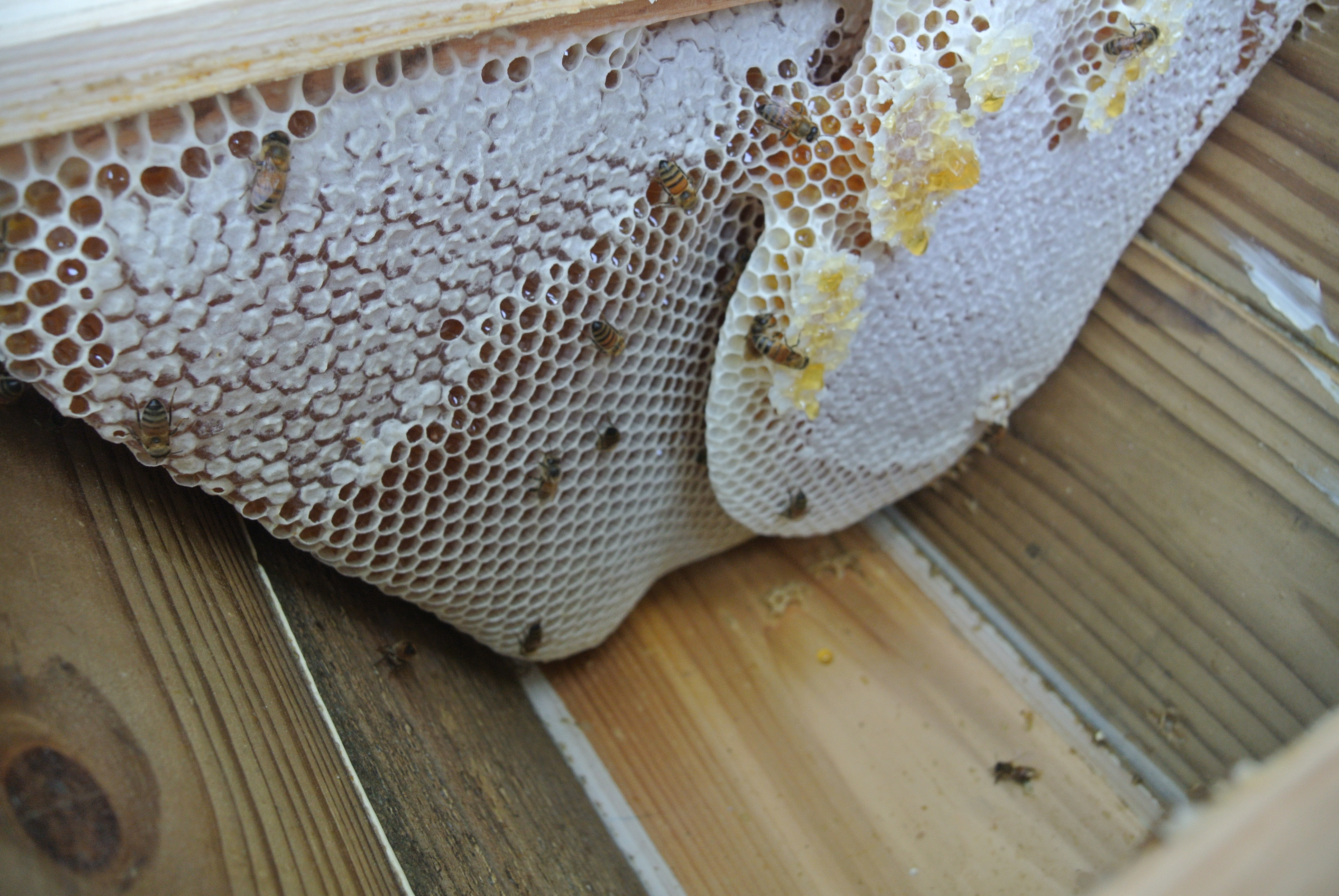 Now I need to make them comfortable. I have a short topbar box needing bees and it has 4 bars of drawn comb, some old heavily propolized bars and a packet of queen scent. Today was day three and the escapees have found a home. I just hope that the weather holds long enough to starve out the queen. Workers are bringing pollen in and I will add a feeder shortly.